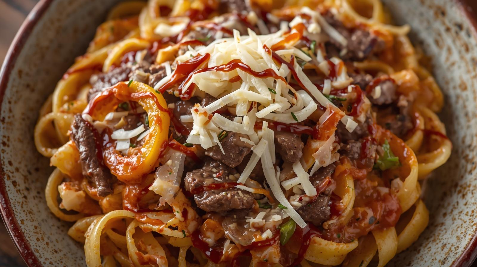 باستا بنا مع شرائح اللحم الفريش مع اضافه المشروم وصوص مشروم و البصل و فلفل الالوان و الصوص البنى اللذيذ.