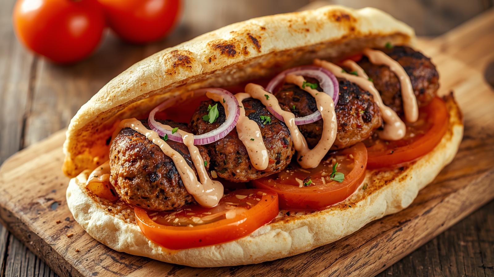 لحم مشوي مع طحينة، بقدونس، طماطم وبصل داخل خبز التورتيلا